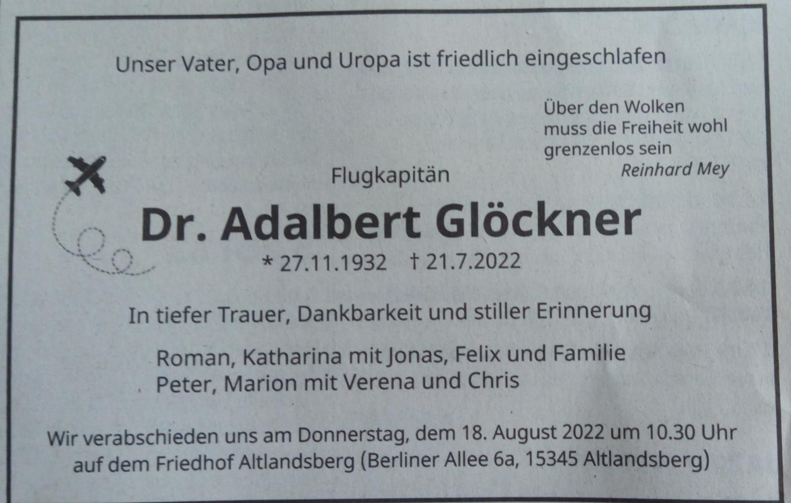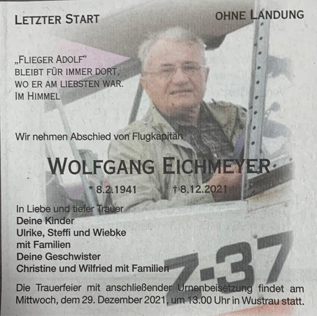 Kurz vor Erreichen des 95. Geburtstag ist am 20.04.2022 ist Willy Kitzman verstorben. Auch über die Liquidation hinaus war er als Hauptbuchhalter der INTERFLUG tätig. Die Trauerfeier ist am 13.05.2022 14 Uhr auf dem Friedhof Berlin-Baumschulenweg Kiefholzstraße 221. |