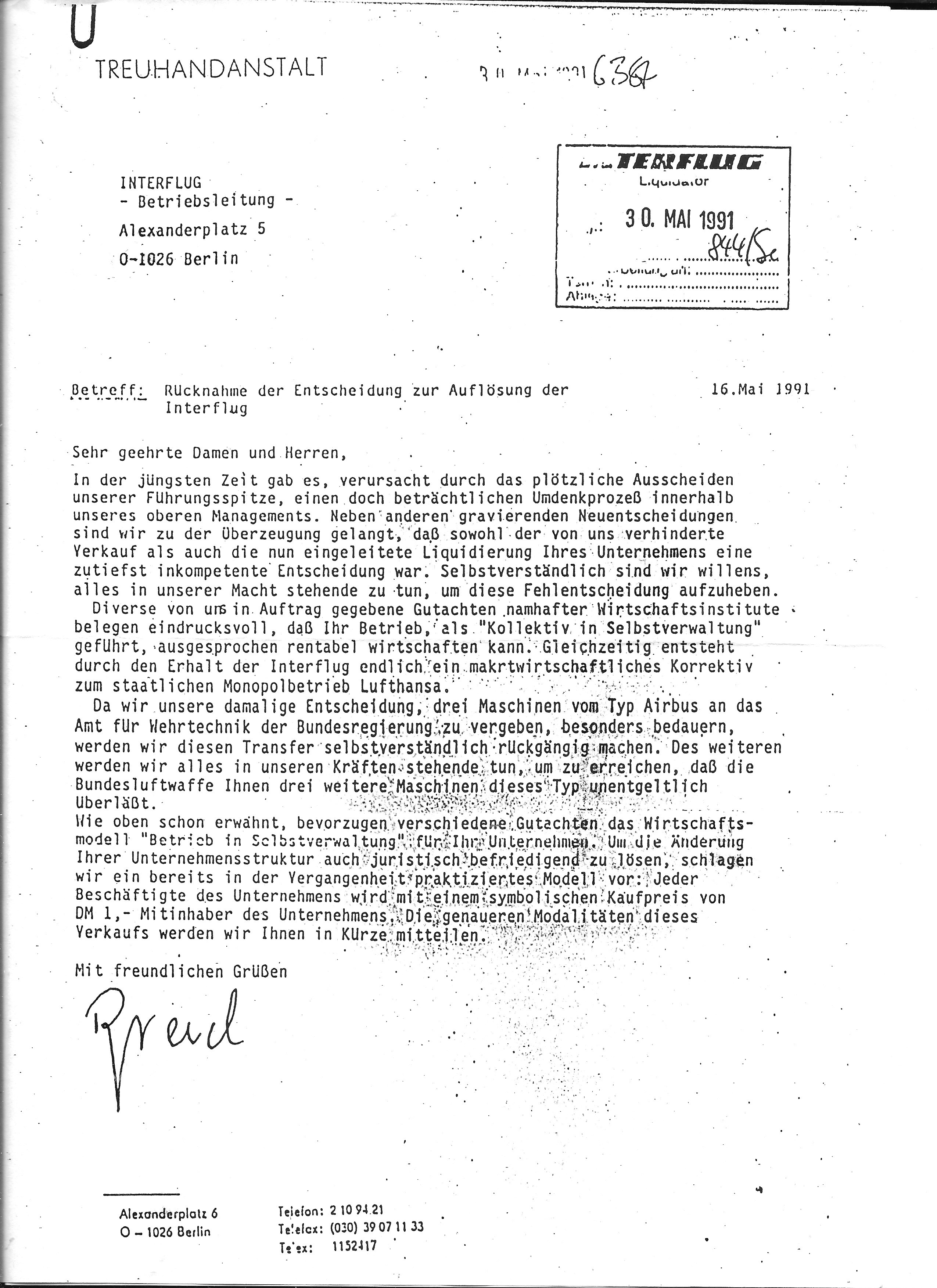 oder fake ? Horst Materna: 20 Jahre nach dem entgültigen Aus für INTERFLUG taucht ein ominöses Schriftstück auf, das, wenn es echt ist, eine Fülle von Fragen nach sich ziehen dürfte. Am 16. Mai 1991 interzeichnet Frau Birgit Breuel, damals Präsitentin der Treuhandanstalt (THA) ein Schreiben an die Betriebsleitung der INTERFLUG mit dem Betreff; Rücknahme der Entscheidung zur Auflösung der INTERFLUG. Nach dem Eingangsstempel landet der Brief am 30. Mai 1991 auf dem Schreibtisch von Herrn Dr. Jobst Wellensiek, Liquidator der INTERFLUG. Darin heißt es u.a. "...dass die eingeleitete Liquidation ihres Unternehmens eine zutiefst inkompetente Entscheidung war, wir sind willens, diese Entscheidung aufzuheben...". Diese Mitteilung blieb ohne jegliche Reaktion und auch das Schreiben selbst findet nirgendwo eine Erwähnung. Ohne den geschichtlichen Verlauf ändern zu wollen, wäre es doch interessant, zu erfahren, warum nach dieser Erklärung nichts geschah oder wer deren Umsetzung verhindert hat.  | 18.10.2020 |